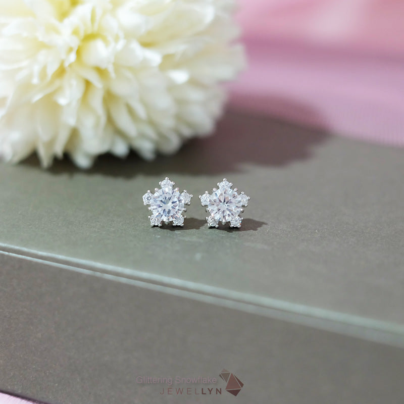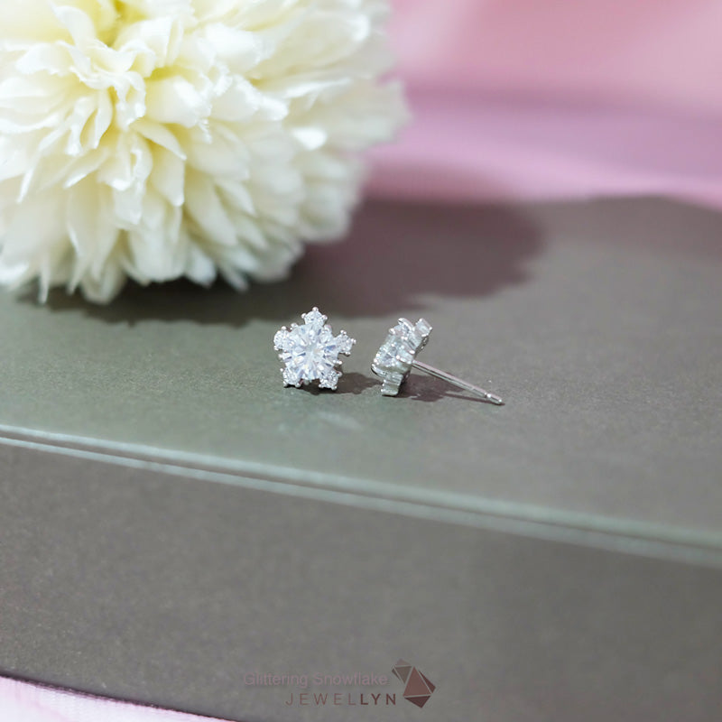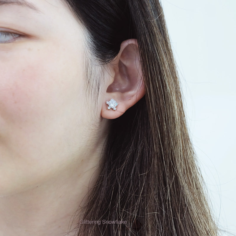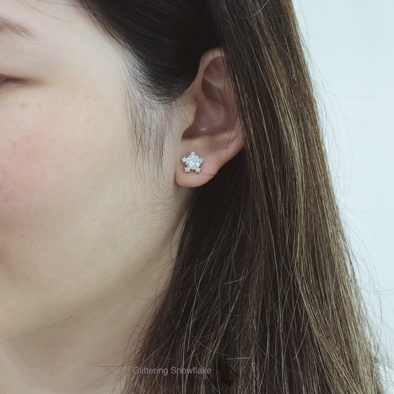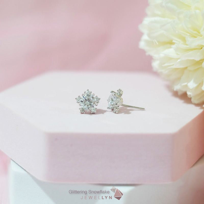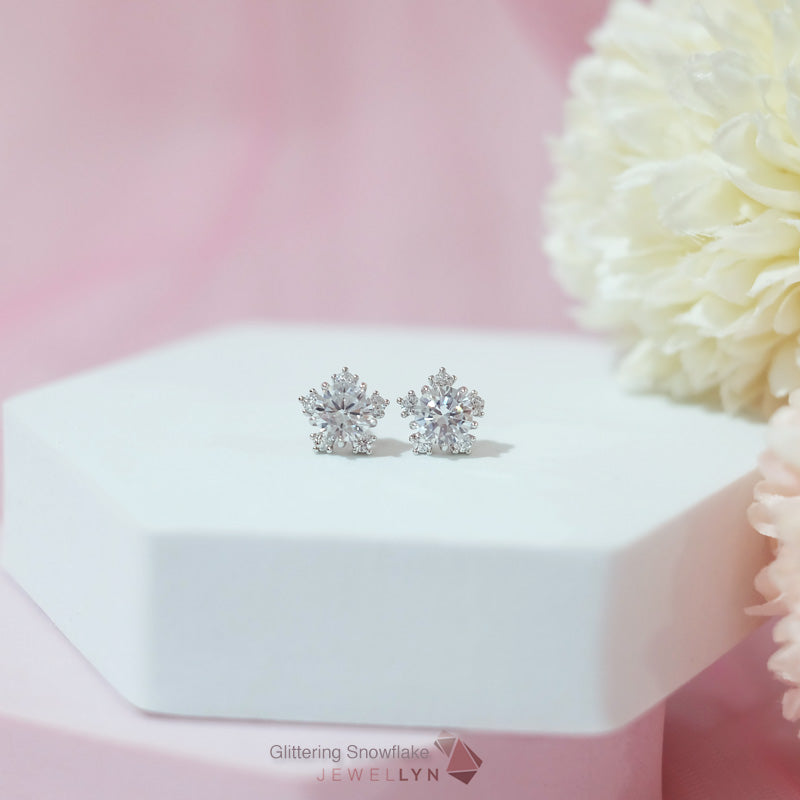 Glittering Snowflake Earrings | ต่างหูเม็ดเดี่ยวล้อมขอบ ดีไซน์รูปเกล็ดหิมะ Snowflake แบบก้านมีแป้นเสียบ ตัวเรือนเงินแท้ 92.5 ประดับเพชร CZ